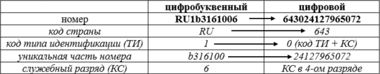 Пока Служба продолжит выдавать УНСМ цифро-буквенного формата. Для «вшивания» таких номеров в электронные средства маркирования, которые поддерживают только цифровой формат, их необходимо будет сначала перевести в этот цифровой формат по приведенной ниже схеме.
