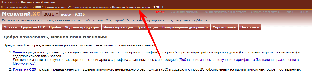 После входа в Меркурий, нажмите на название обслуживаемого предприятия: